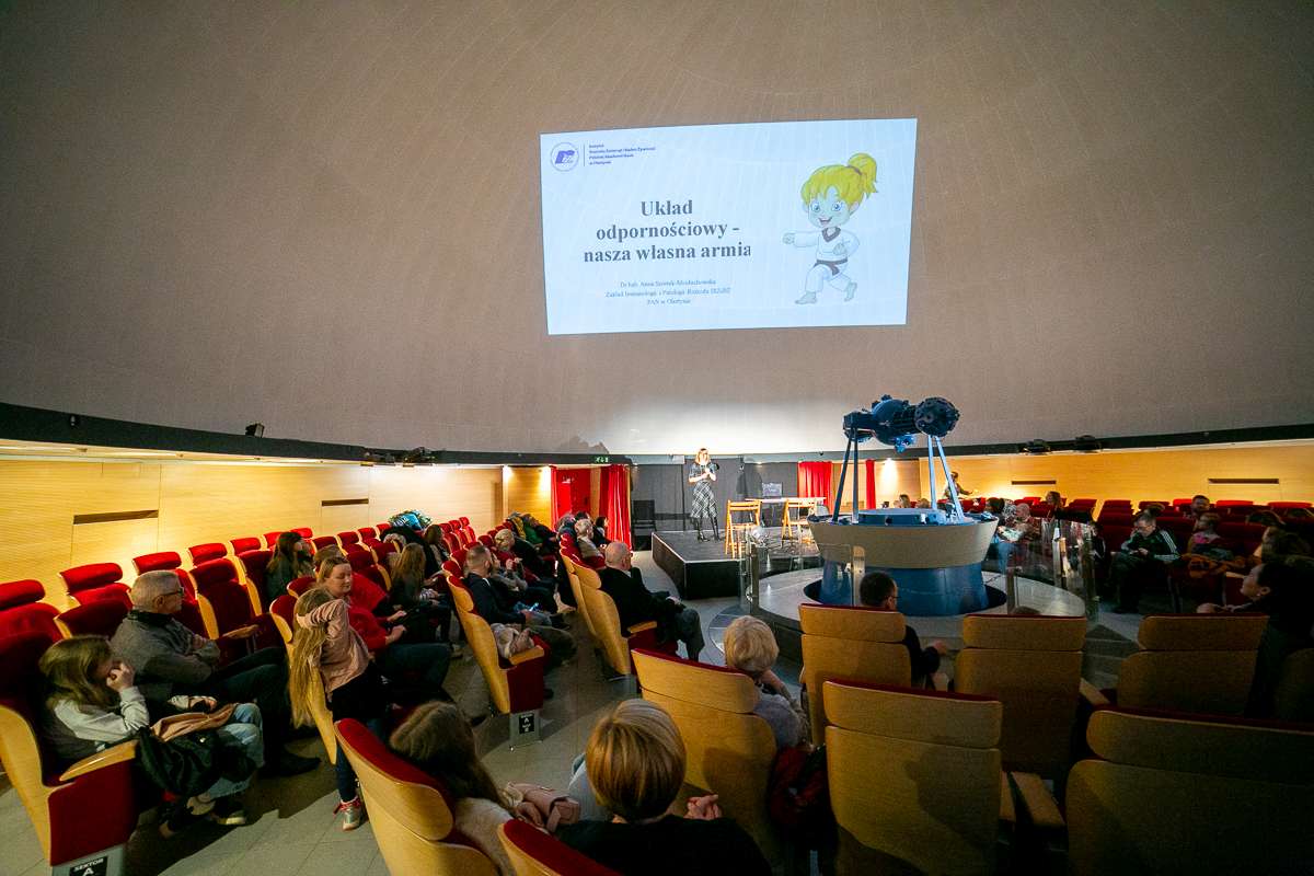 Za nami kolejne wyjątkowe spotkanie z Olsztyńską Akademią Dzieci. Tym razem z młodymi studentami spotkała się dr hab. Anna Szóstek-Mioduchowska, która opowiedziała słuchaczom o zagadnieniu szczególnie ważnym w sezonie jesienno-zimowym – układzie odpornościowym. Pani Doktor zwróciła uwagę na „narzędzia”, jakimi dysponuje organizm człowieka w obronie przed szkodliwymi czynnikami zewnętrznymi i wewnętrznymi. Jakie komórki odpornościowe znajdziemy w ciele człowieka i ile ich jest w jednej kropli krwi? Czym różni się odporność wrodzona od nabytej? Co mówi nam ciało, kiedy dotykają nas dolegliwości charakteryzujące stan zapalny? Na te i wiele innych pytań szukano odpowiedzi podczas spotkania.
